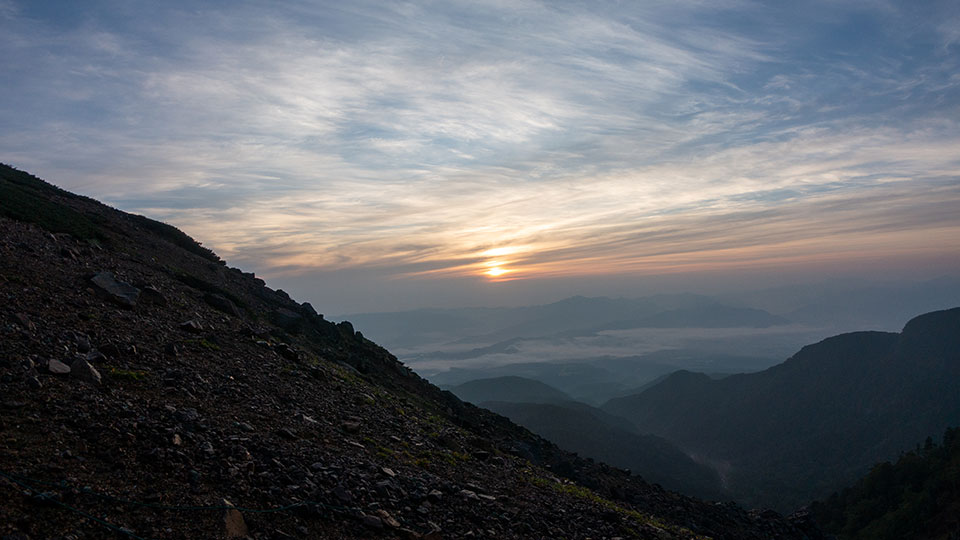 残念ながら雲が多くてすっきりしないご来光となりましたが、ギリお日様が覗いてくれました。