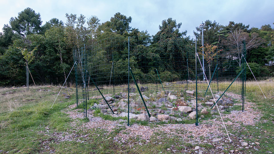 草地の中央には花壇と鹿避けの柵が設置されてました。