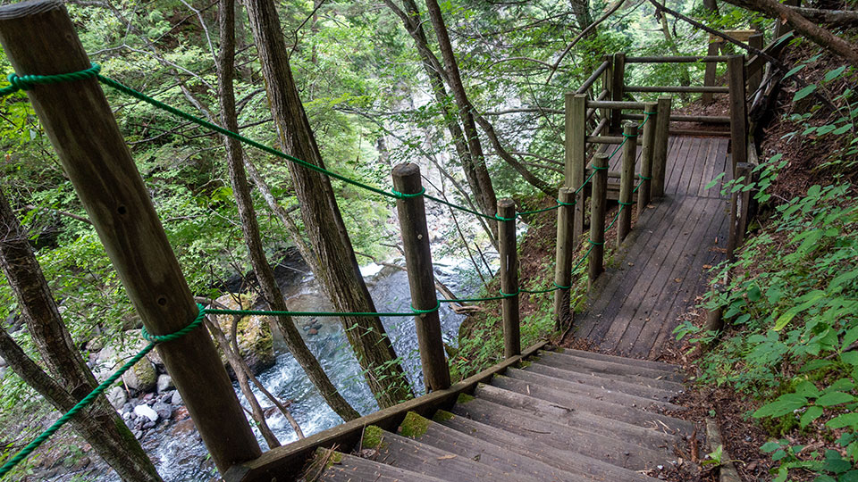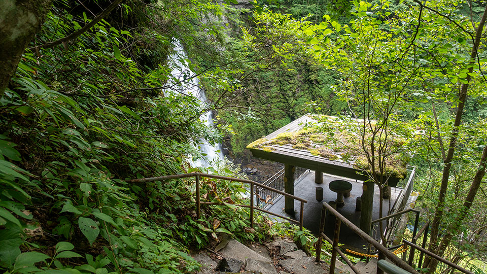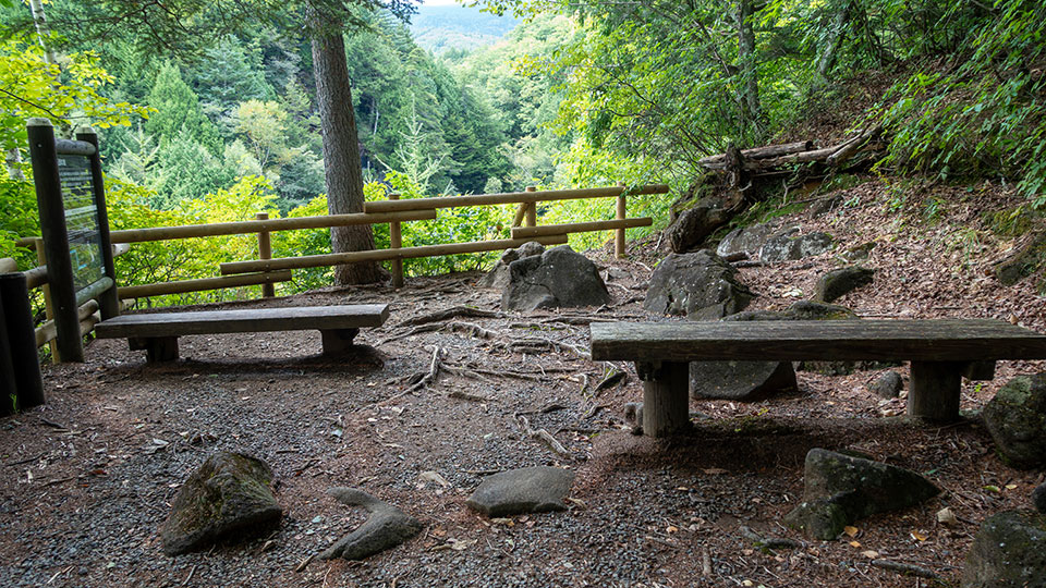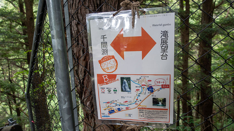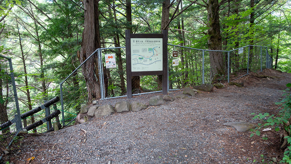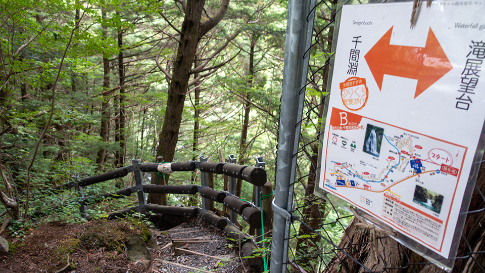 右が観瀑台で、左が千間淵(せんげんぶち)散策コースです。