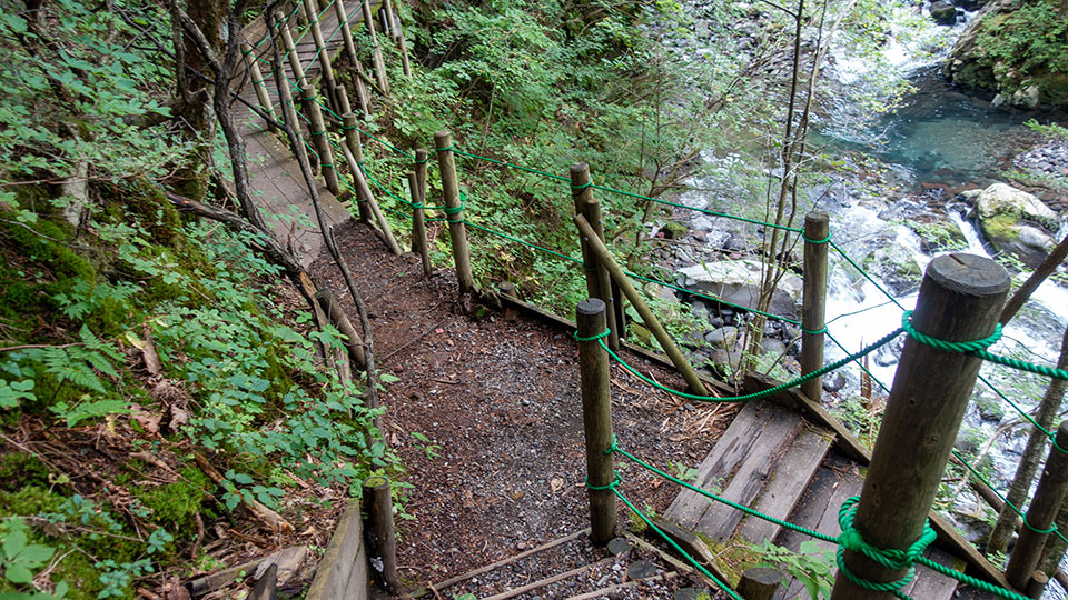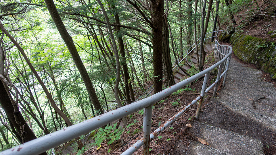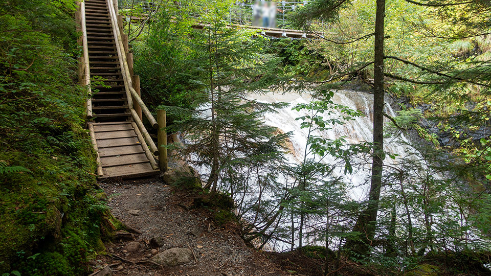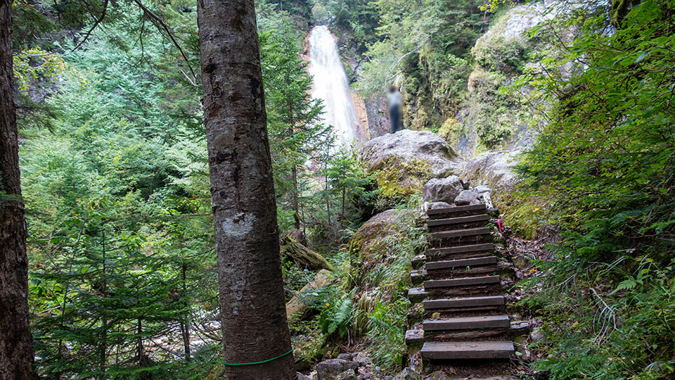 正面の橋の先が滝で、左の階段を登ると散策路が続いている様です。