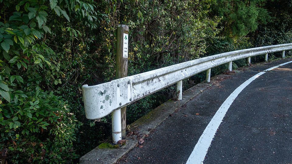 神社前のガードレールの脇にひっそりと立つ標柱。