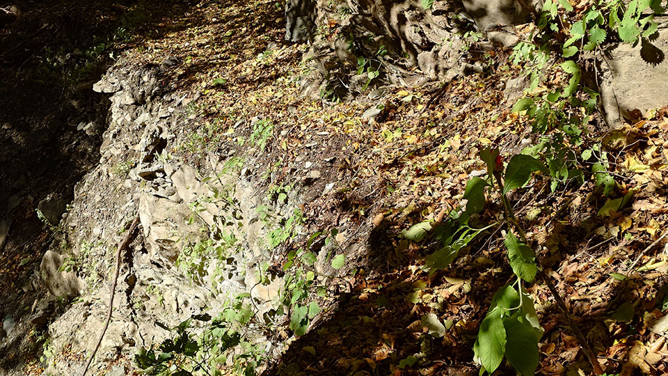 堆積した落ち葉と路面の土が脆くなっていた様で、ズルズルと谷間に滑ってしまった!!
